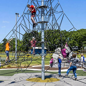 Rope climbers consist of vertical ropes or net structures that children can climb using their hands and feet. They promote upper body strength, coordination, and grip control.